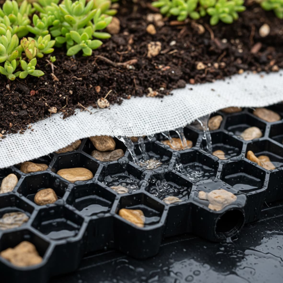 • Végétation : sedums, graminées, vivaces fleuries, petits arbustes ou couvre-sols mixtes.