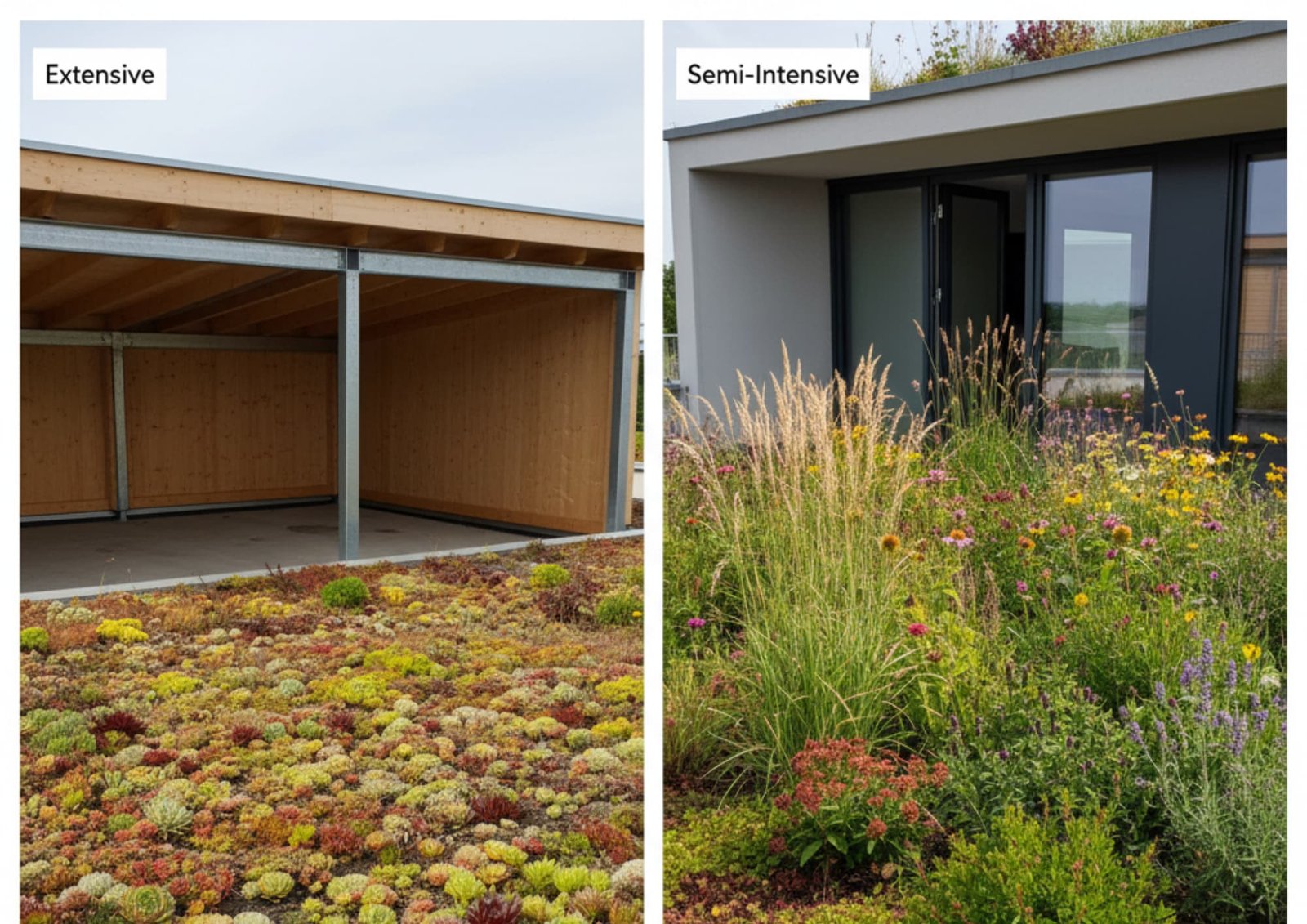 Comparaison entre deux toitures végétalisées : une toiture extensive sur un abri vélo bois avec structure métallique, et une toiture semi-intensive sur un bâtiment moderne avec façade vitrée.