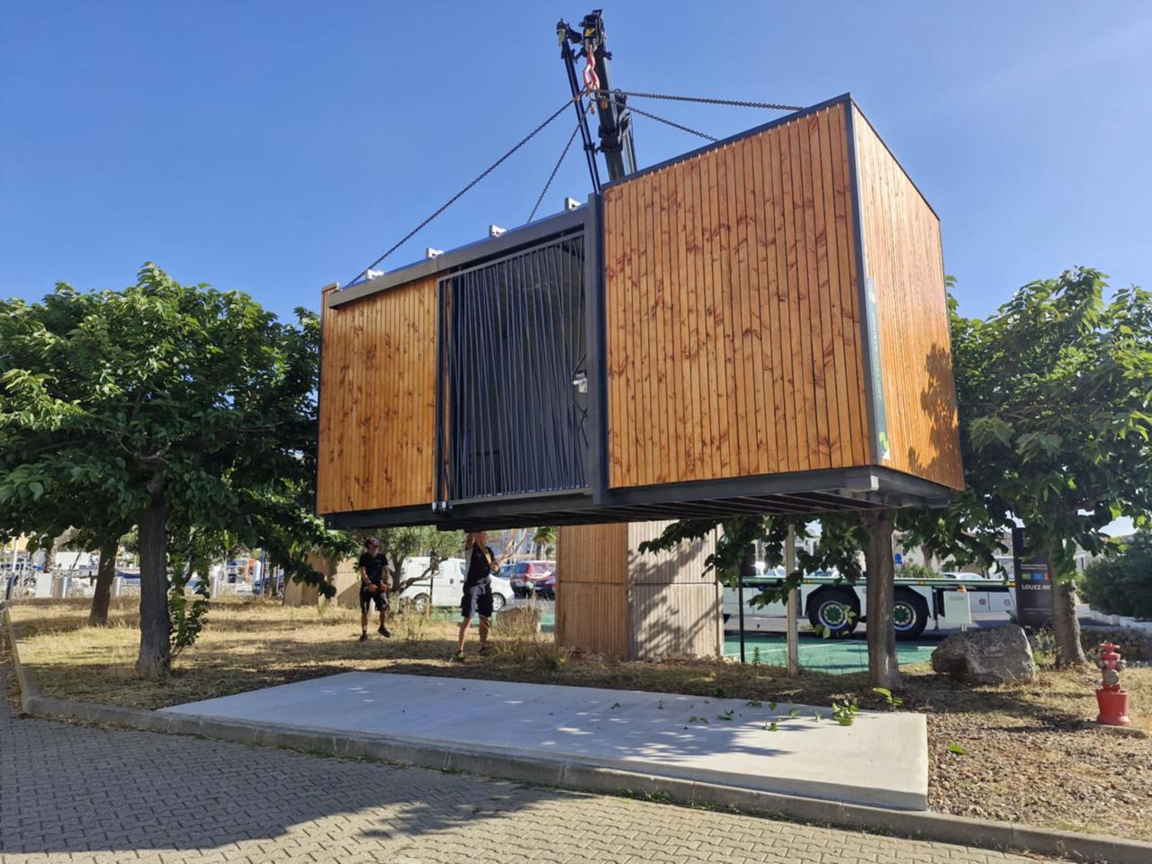 Maritime se entrega montado, con suelo integrado: la ficha técnica prevé su instalación sobre asfalto (≥ 6 cm) o sobre bloques de hormigón, según su emplazamiento. El resultado: una implantación «llave en mano», sin necesidad de ingeniería civil compleja.