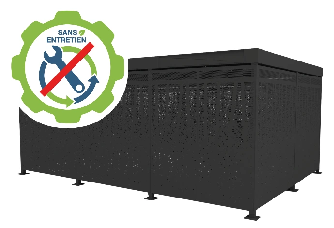 C'est justement un de ses intérêts. Avec ses parois métalliques perforées et sa structure acier galvanisé, le produit évite la logique d'entretien bois et la surveillance d'un bardage qui grise dans le temps. C'est un fermé pensé pour être simple à exploiter durablement.