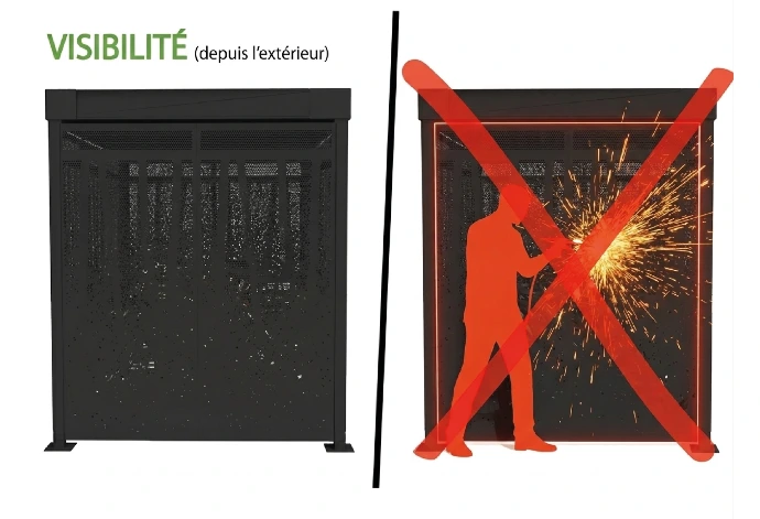 Ses parois métalliques ajourées design minéral laissent moins voir l'intérieur qu'un abri fermé très ouvert. Le produit apporte donc à la fois une fermeture maîtrisée, une meilleure discrétion du stationnement et une présence architecturale assumée.
