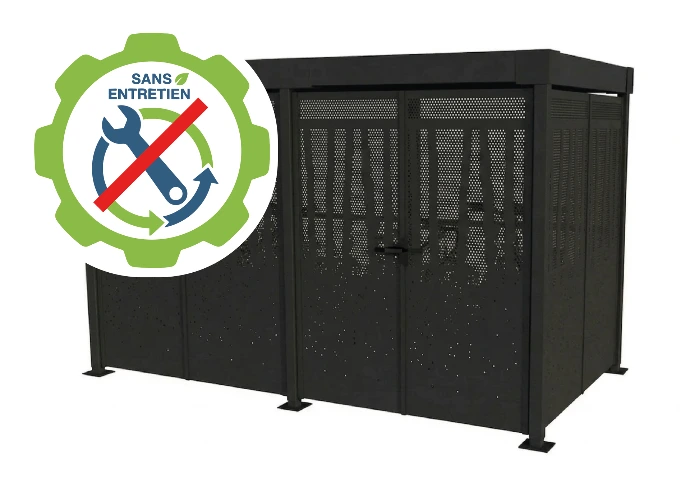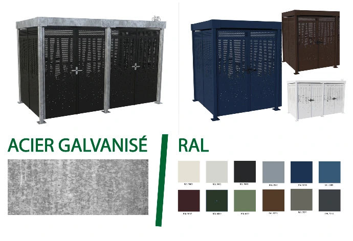 Ajoutez à cela une toiture en bac acier nervuré et une finition RAL personnalisable, et vous obtenez un local vélo fermé qui reste cohérent visuellement sur des années, avec une maintenance perçue plus simple.