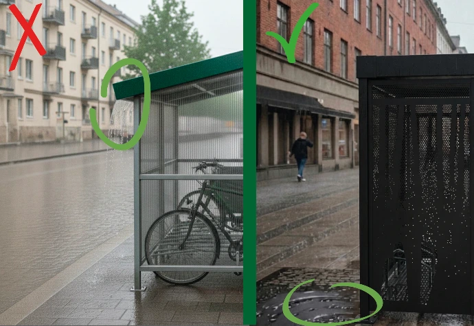 Sur un abri fermé compact, ce type de détail compte : l'équipement reste plus lisible au quotidien, protège mieux les usages et évite de laisser la gestion de l'eau au hasard autour des accès.