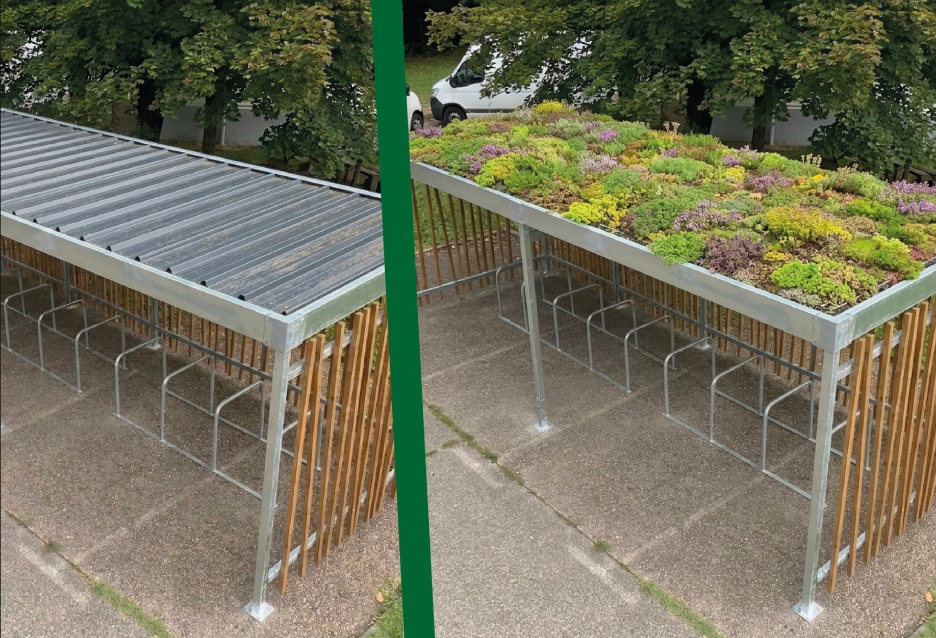 La toiture végétalisée adoucit l'aspect minéral de l'abri et améliore immédiatement la qualité perçue de l'aménagement.